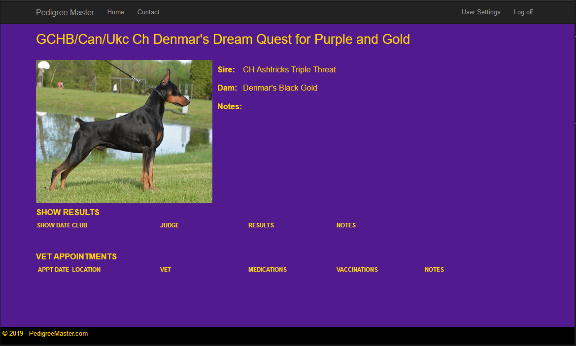 Create Animal Pedigress With PedigreeMaster.com!Store and share pedigrees for any breed of animal, also track your animals show results and vet appointments. Set reminders for shots and other items you don't want to lose track of! Print a physical copy or get a link that you can share with others to view the animal pedigree or link it directly into your own web page! For just $2.99 a month (with a free month free trial) or 29.99 per year create unlimited animal pedigrees all stored online and available anywhere.